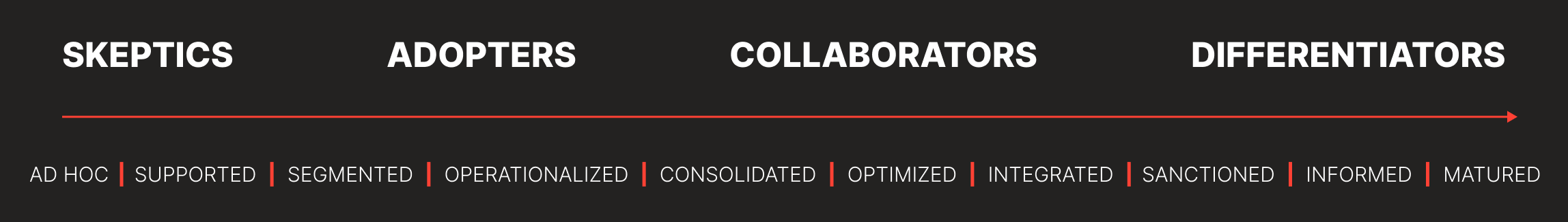The Marketing Maturity Scale below was developed by Lorberix’s Consulting team, and it outlines four progressive phases: Skeptics, Adopters, Collaborators, and Differentiators. Each phase represents a stage of operational growth, tool adoption, and strategic alignment.
