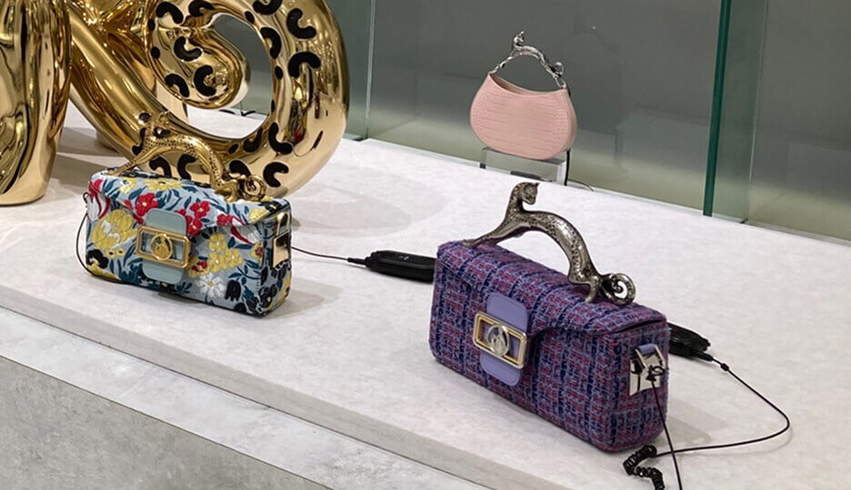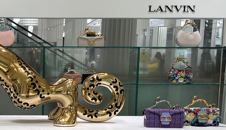 To capture Lanvin’s luxe style, we crafted a series of plinths with felt tops to display designer bags on. Emblazoned on the hero centerpiece was the brand’s cat logo with a gold-chrome finish.