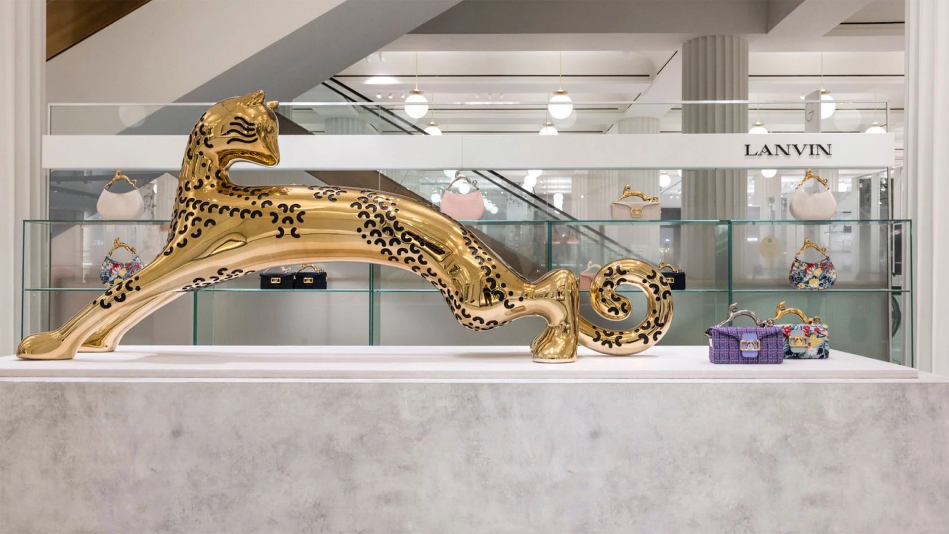 为了捕捉 Lanvin 的奢华风格,我们制作了一系列带有毛毡顶的底座,用于展示名牌包袋。英雄中心装饰品上印有该品牌的猫标志,采用金色镀铬饰面。